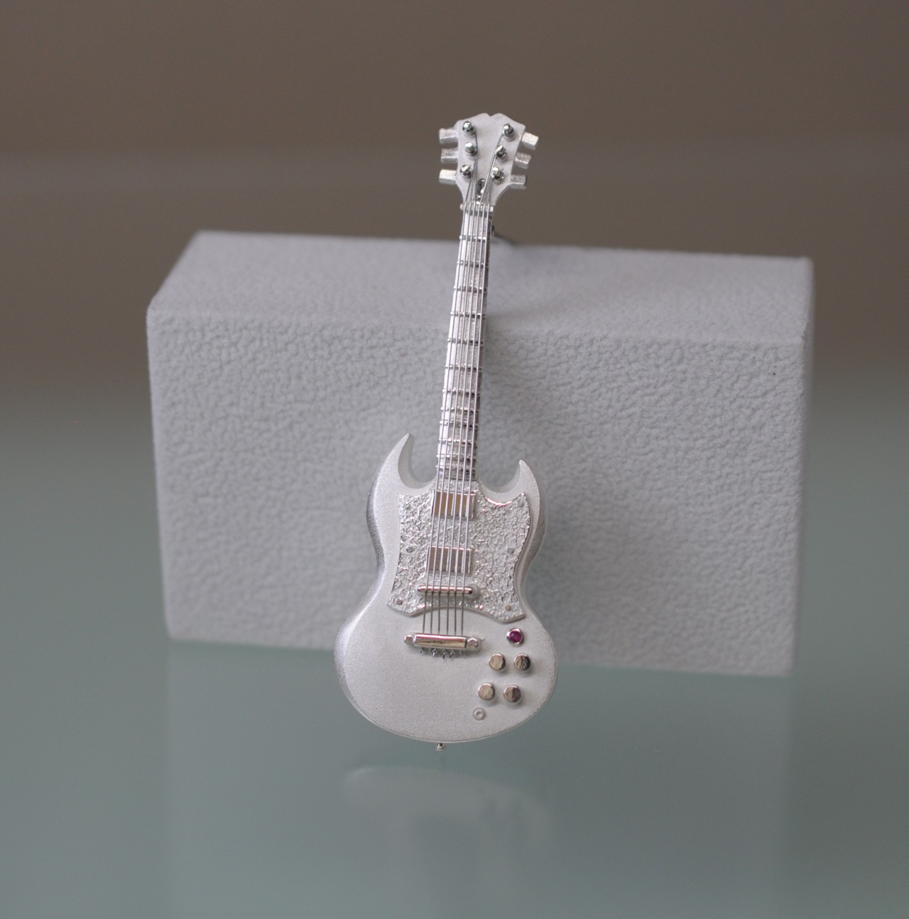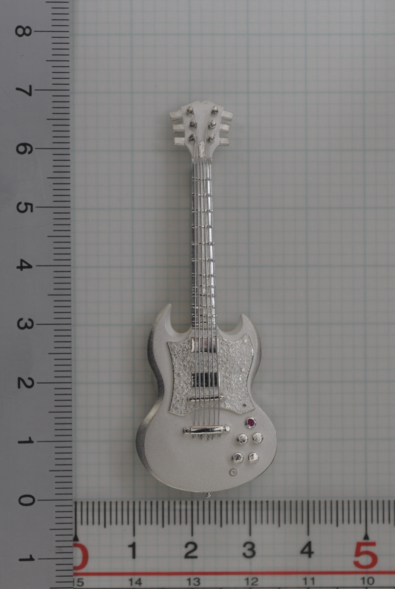 「ソリッドギター」その響きのように洗練された形は小さなブローチづくりでも緊張感を実感できる仕上がりです。