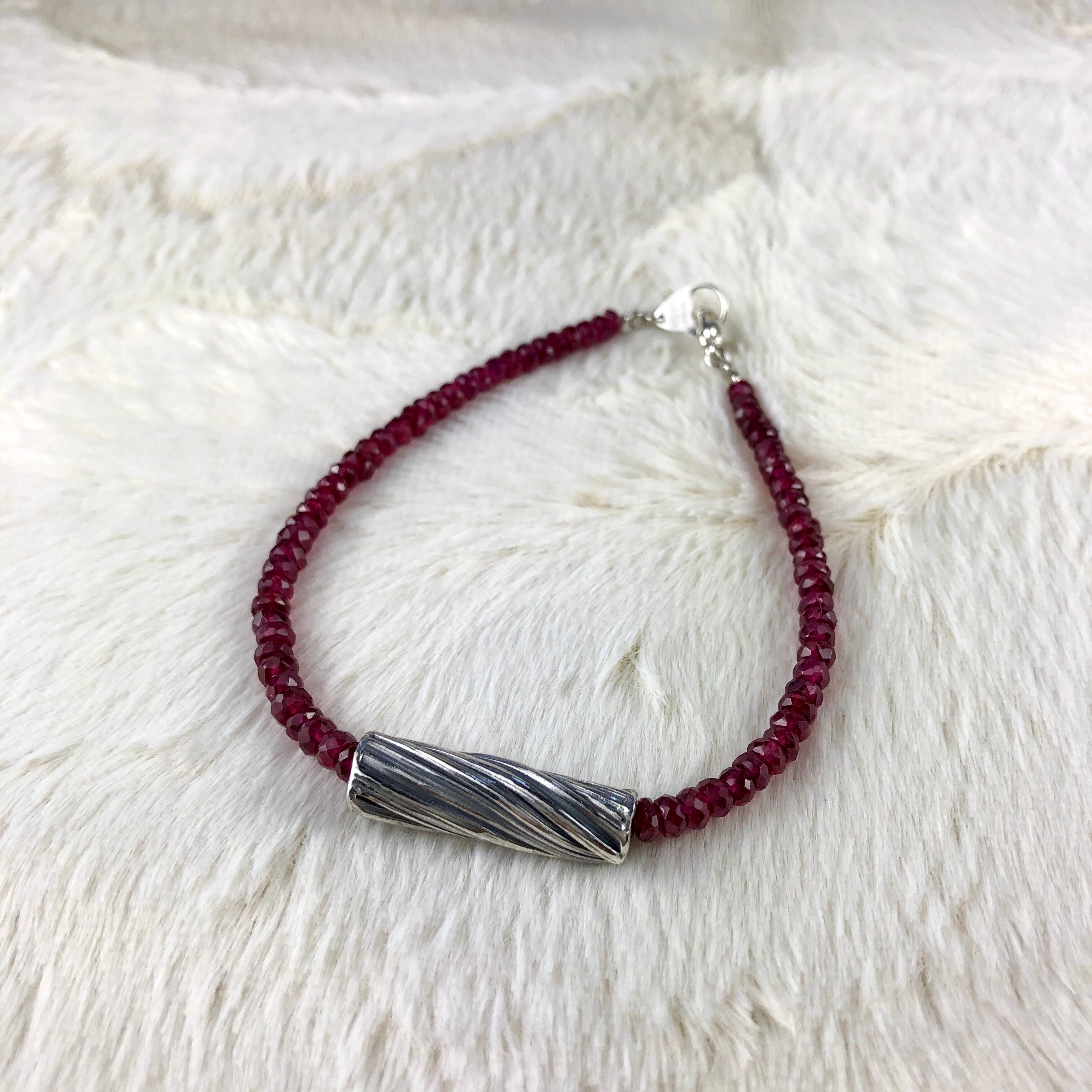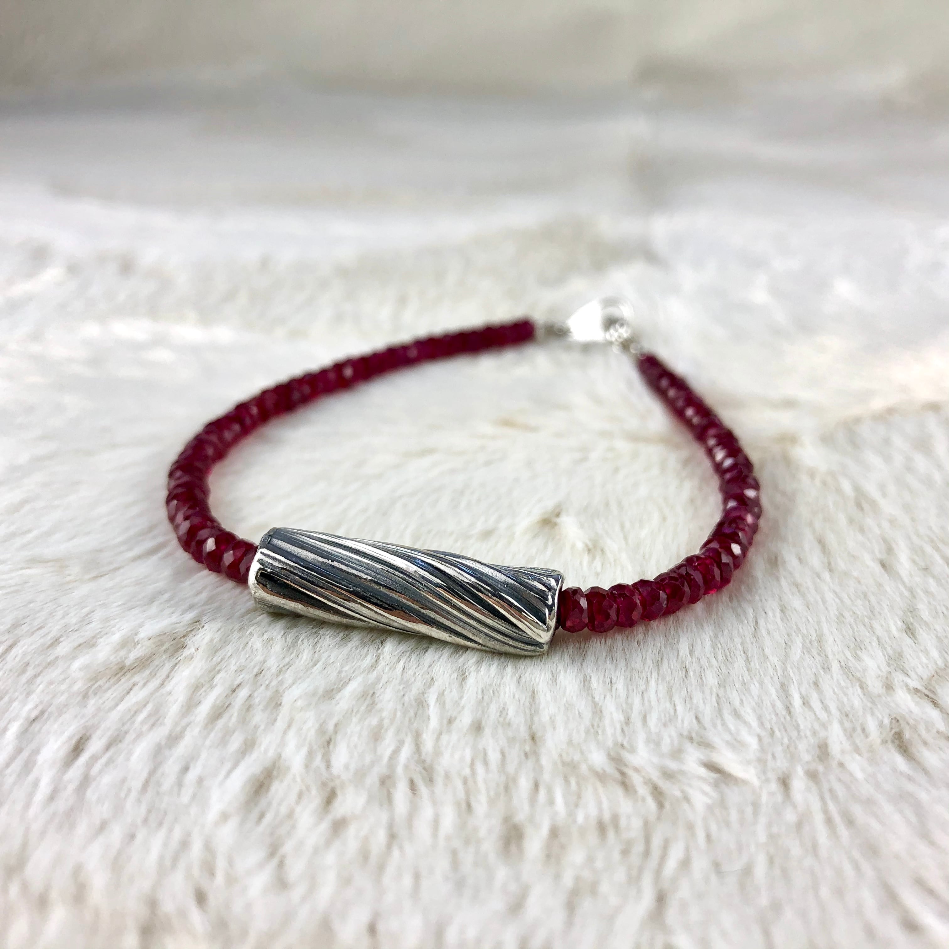 コランダム の ルビーカラー ビーズ と古美(ふるび)加工をした シルバーパーツ で、渋みのあるダークレッドの ブレスレット。