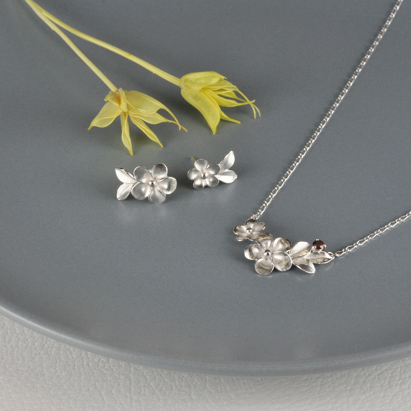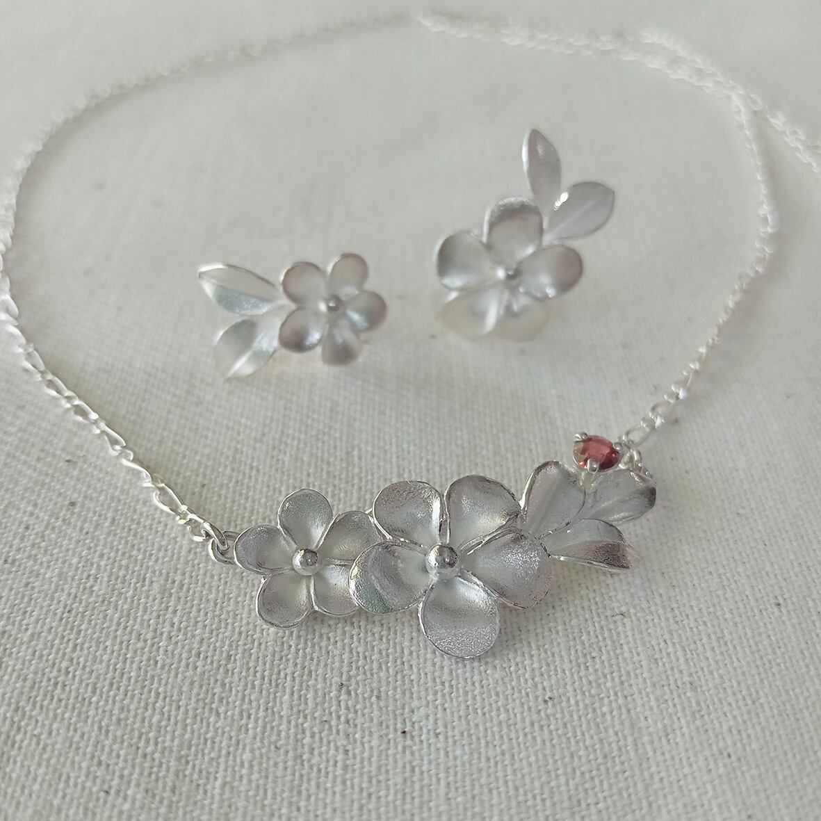SILVERの白い花の中に深みを感じる天然のガーネットがぎゅっと目線を誘います。