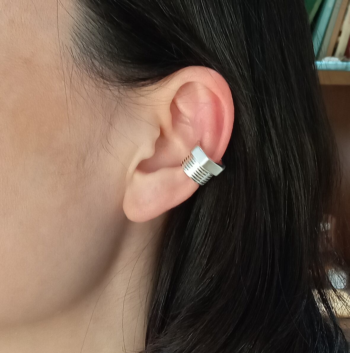 大きさとデザインからイヤカフにすることが難しかったのですが、長さのバランスや肌に触れるネジの部分が不快にならないようにデザインを検討し、丁寧に裏抜きをすることで耳に負担にならない重さを実現できました。