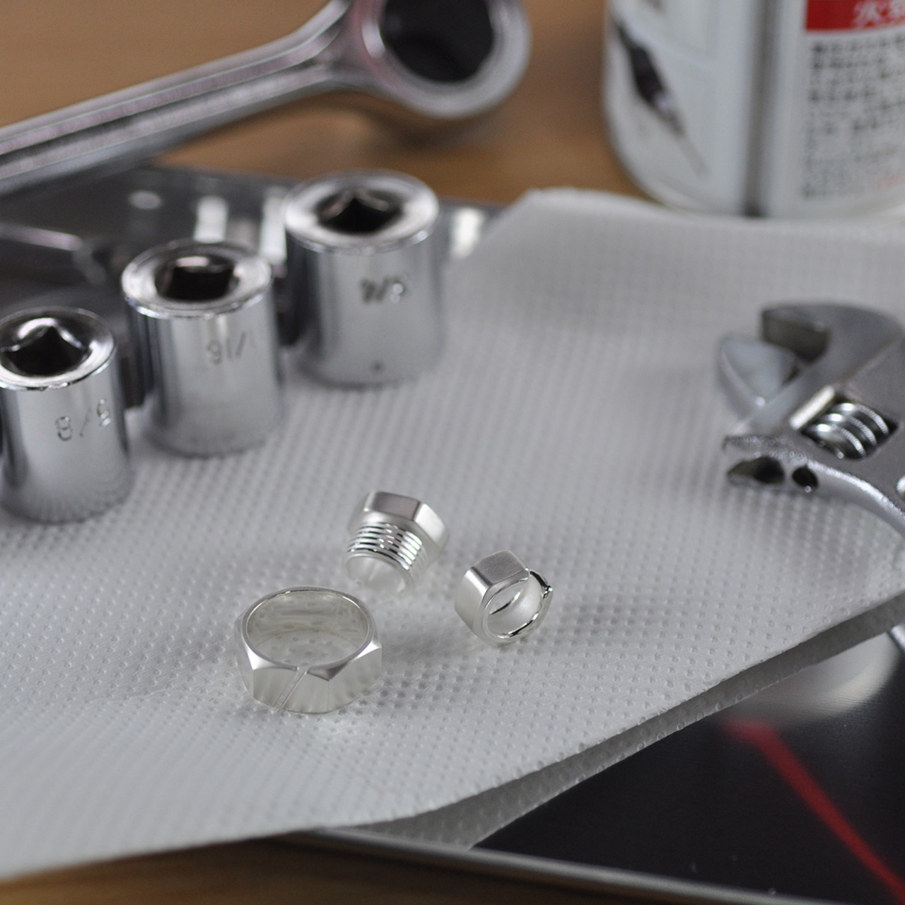 ネジ ボルト ナット など身近にある物の中でも大好きな物です。そんな大好きな物をオシャレにカッコよく身に着けたいというコンセプトで ボルト・ナットシリーズを製作しました。