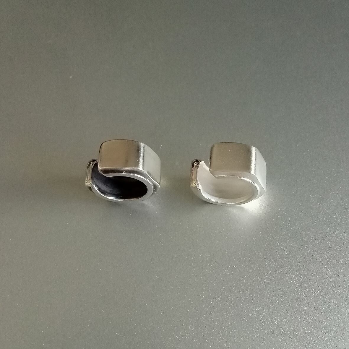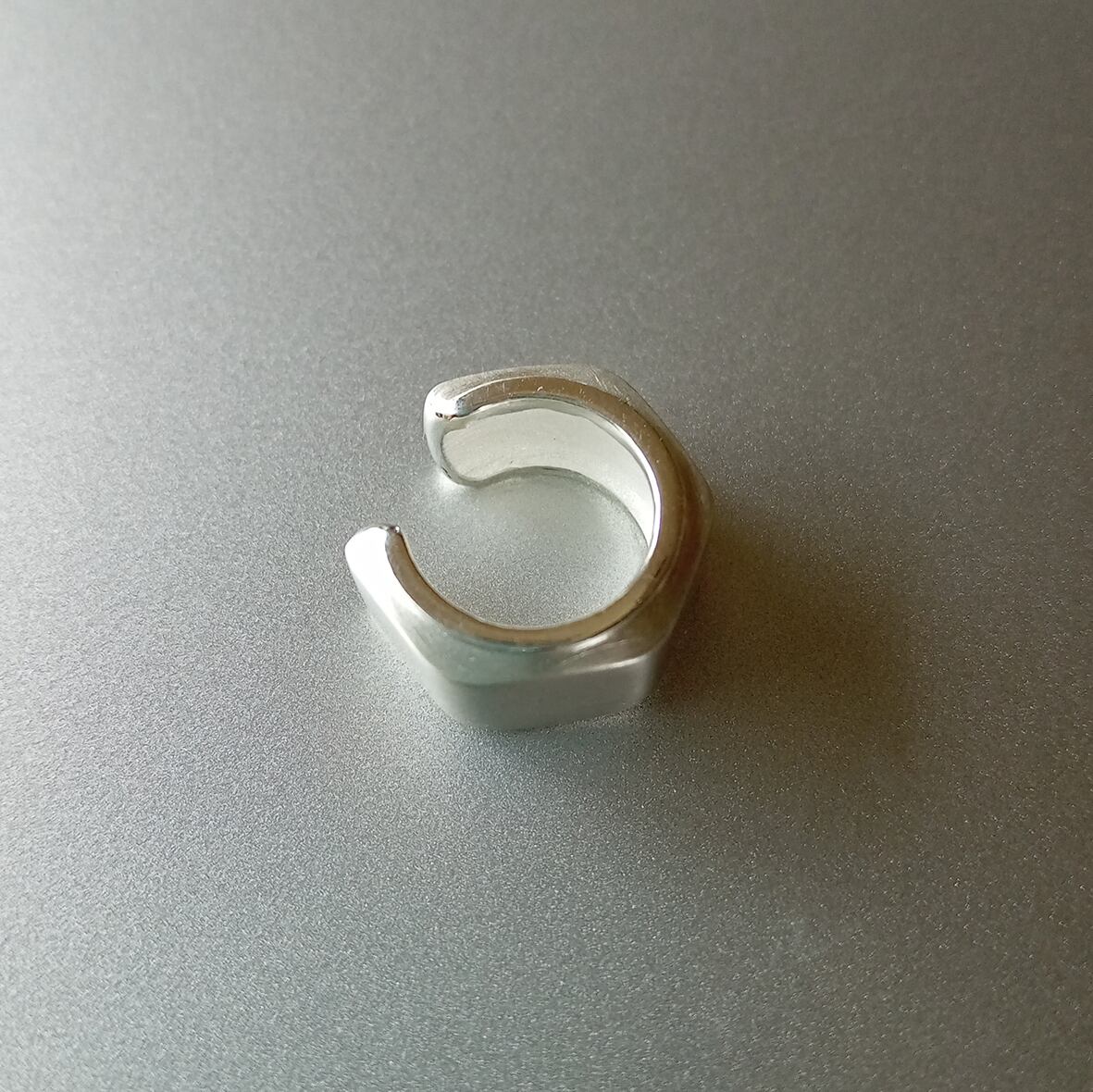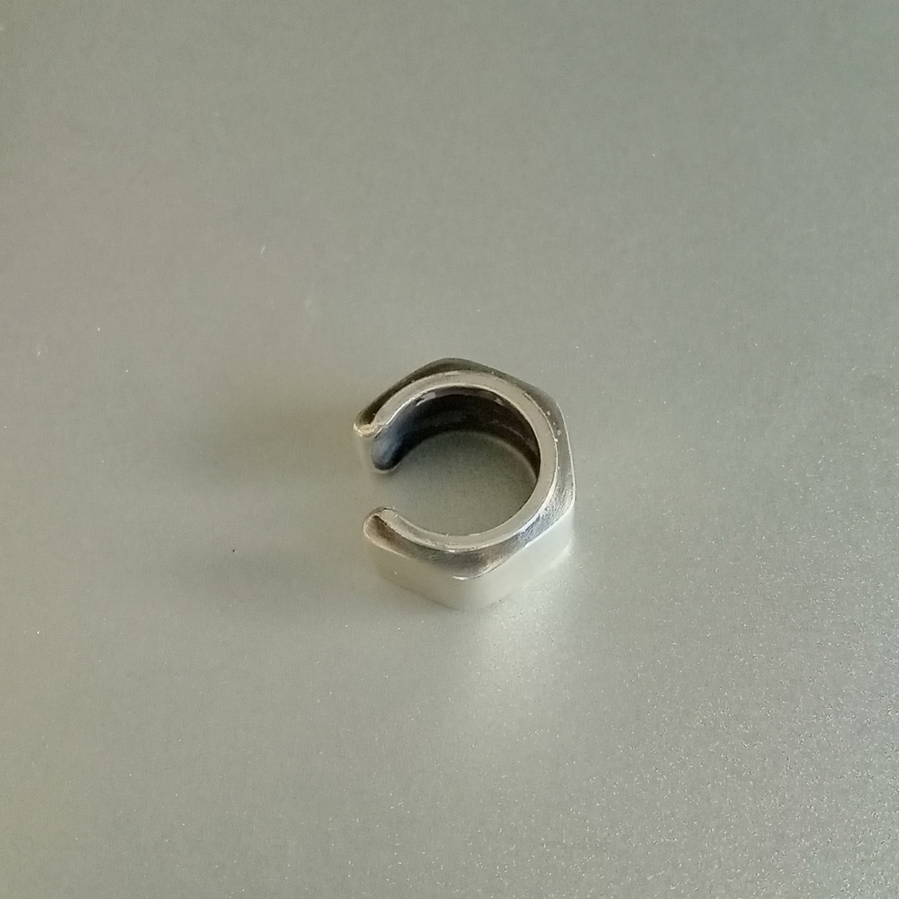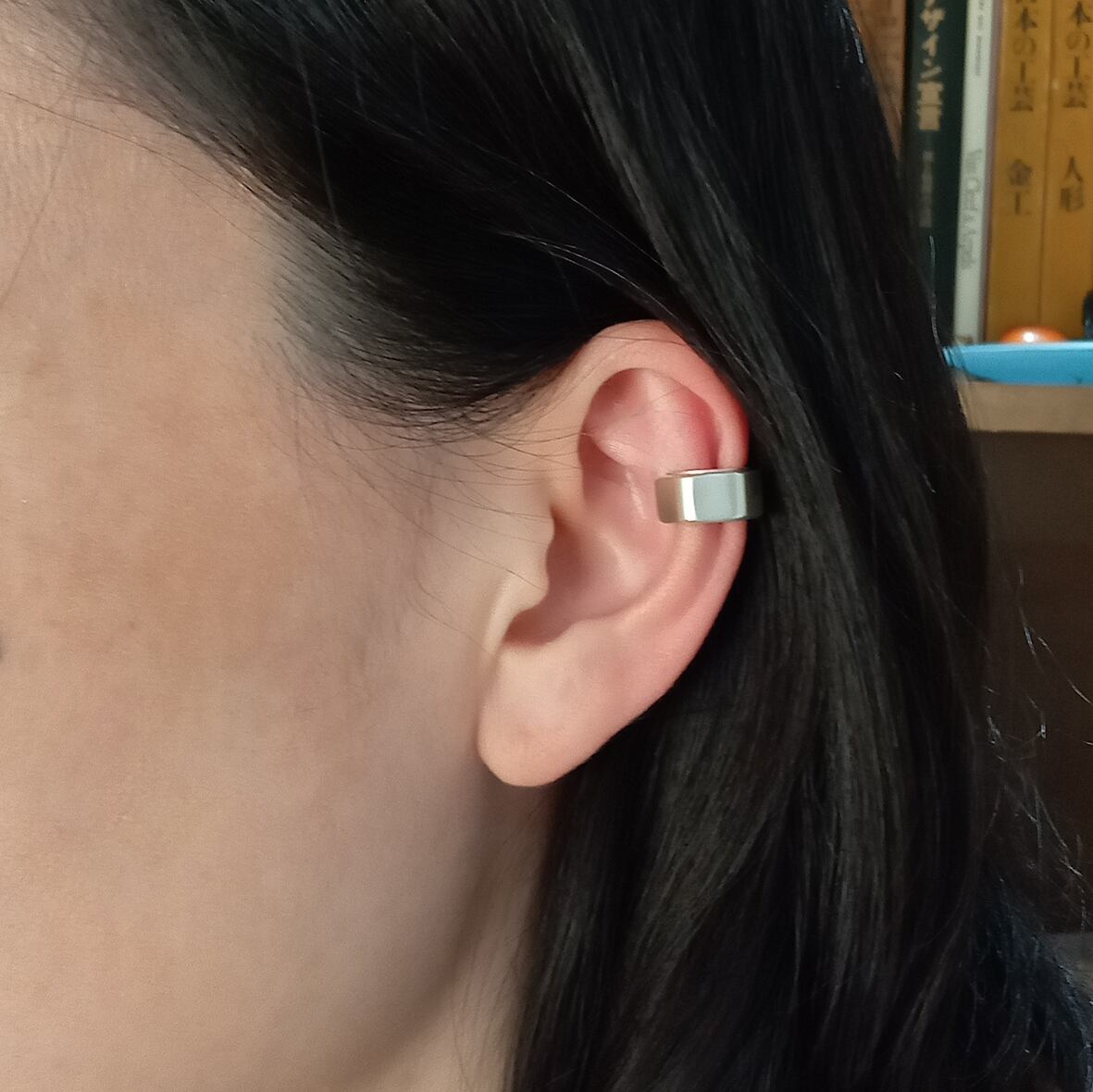 耳に触れる部分は鏡面仕上げです。また内側を裏抜きする事で見た目のボリュームをのこしながら耳に負担のない重さを目指しました。ナットでは物足りない方にはボルトモチーフのイヤカフもあります。