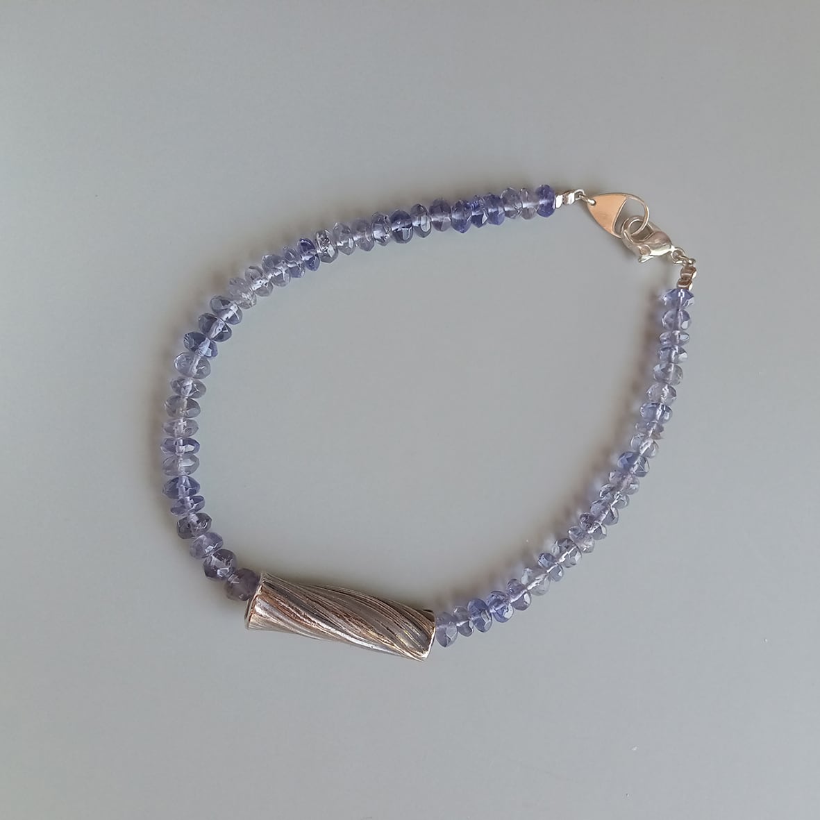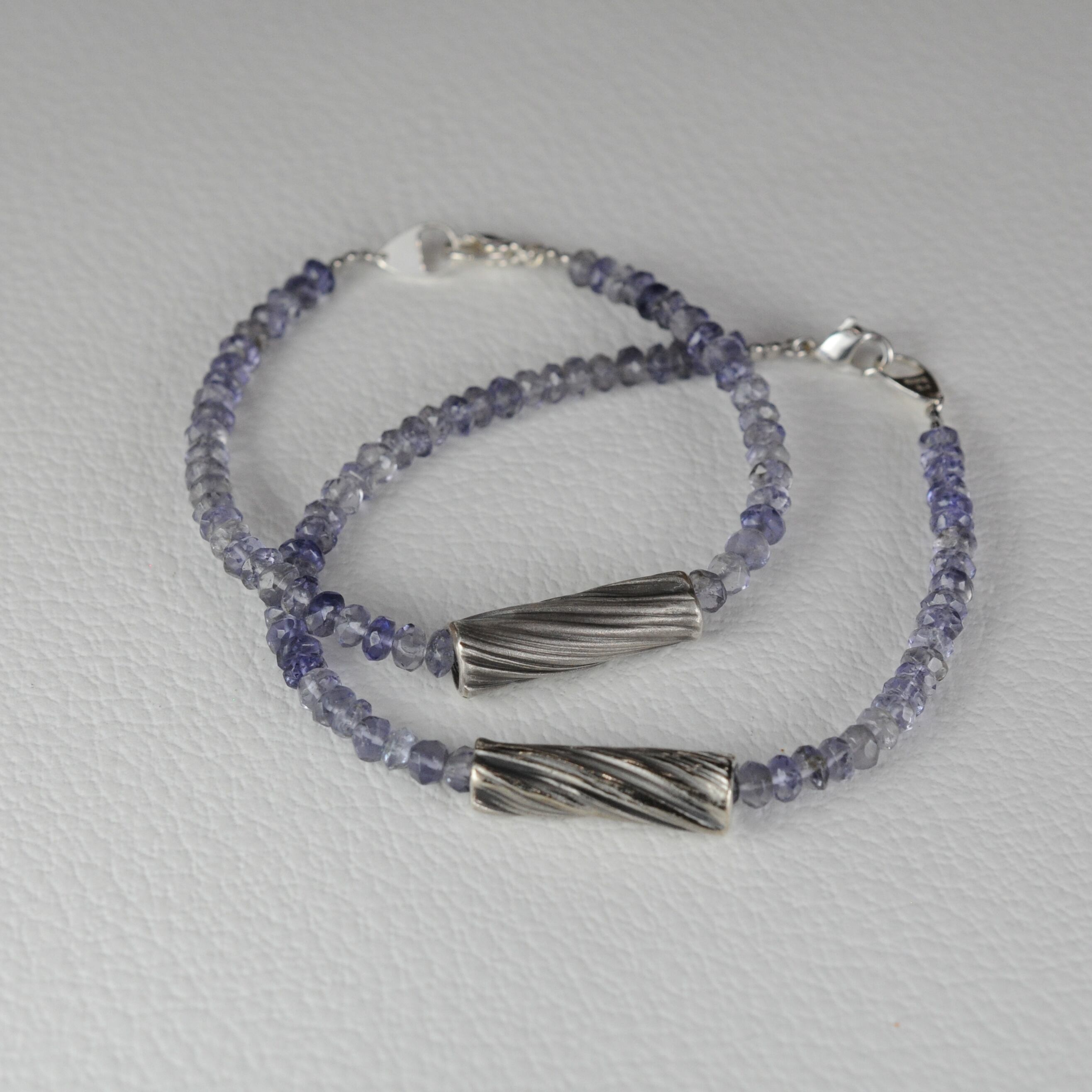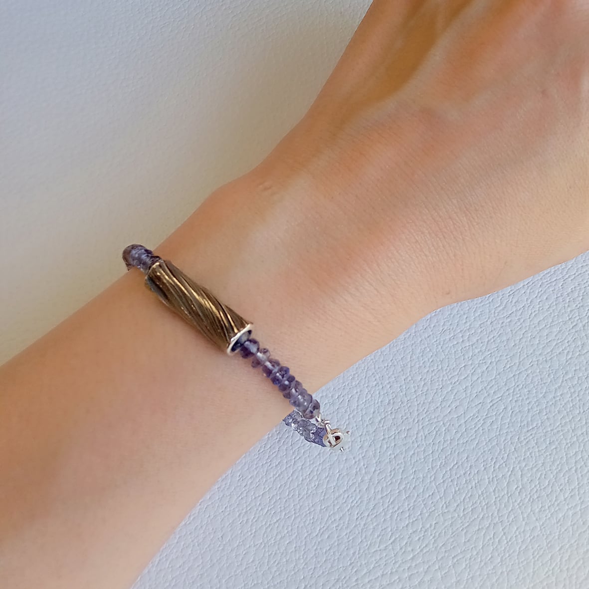 夕暮れブルーを思わせる濃淡の美しいアイオライトと古美(ふるび)仕上げをしたシルバーの筒を組み合わせた粋な大人のブレスレット