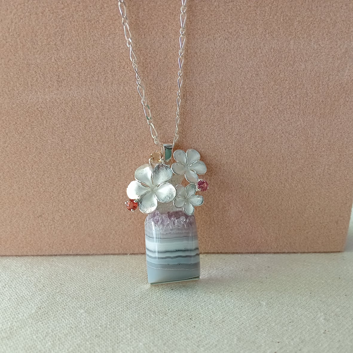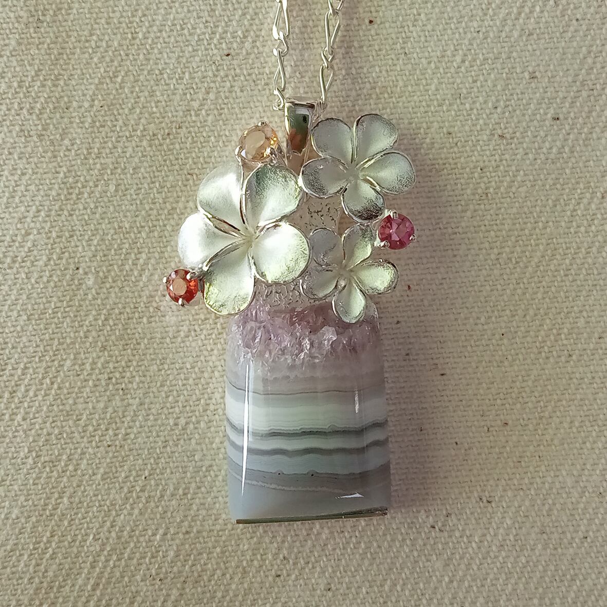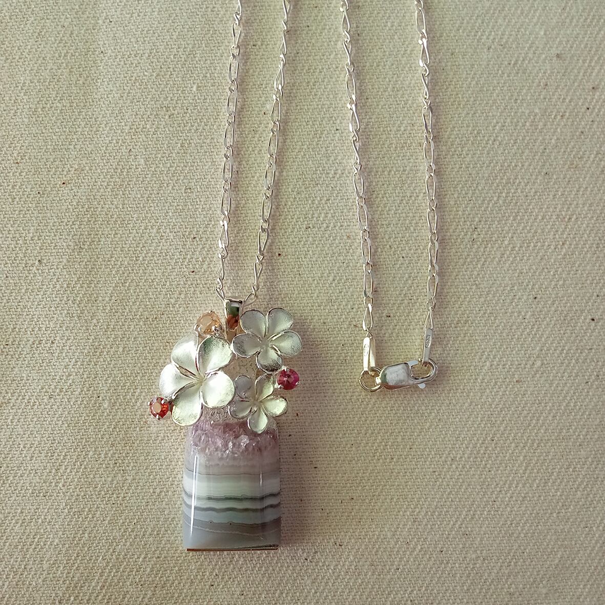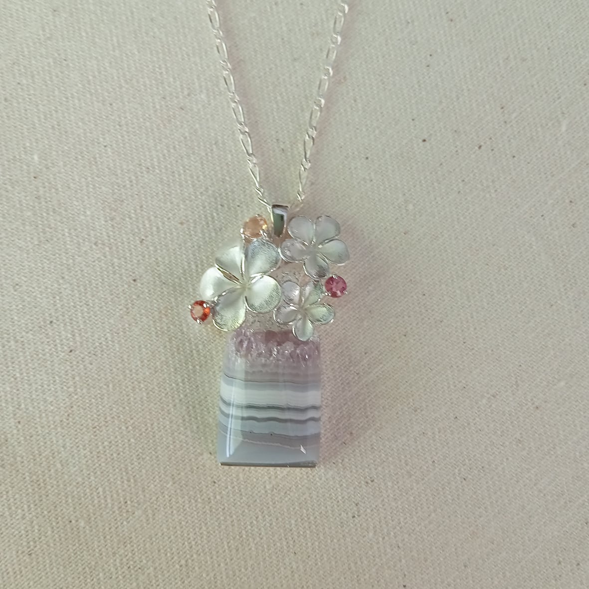 クオーツの結晶とアゲートの何層もの模様に、遠くの山並みを川面に映し出す夜空の花火を思い浮かべた『景色のペンダント』ができました。
