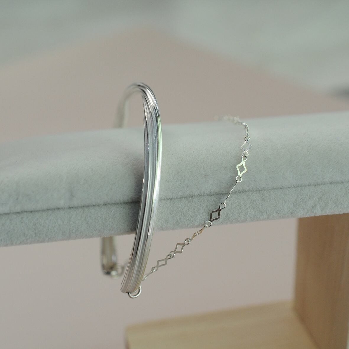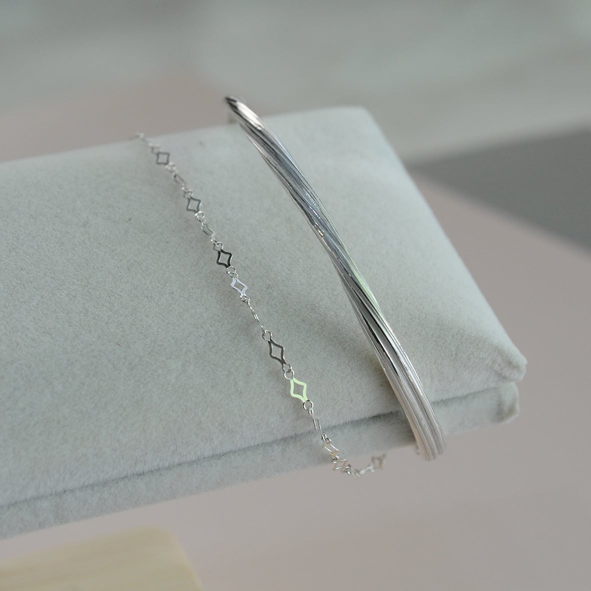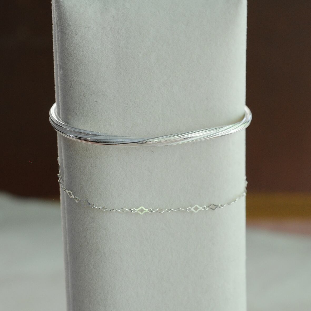 清廉な流れのような自然の平行線と、華奢で儚げな光のチェーンが組み合わさった2連のSILVER 蜜蝋ひきめバングル。